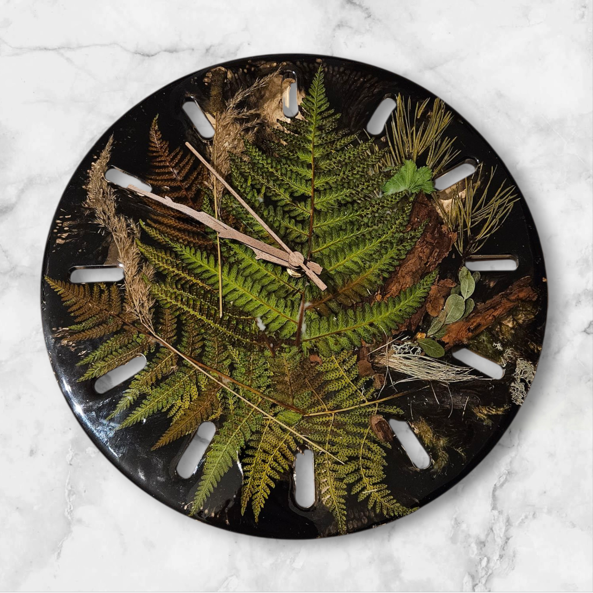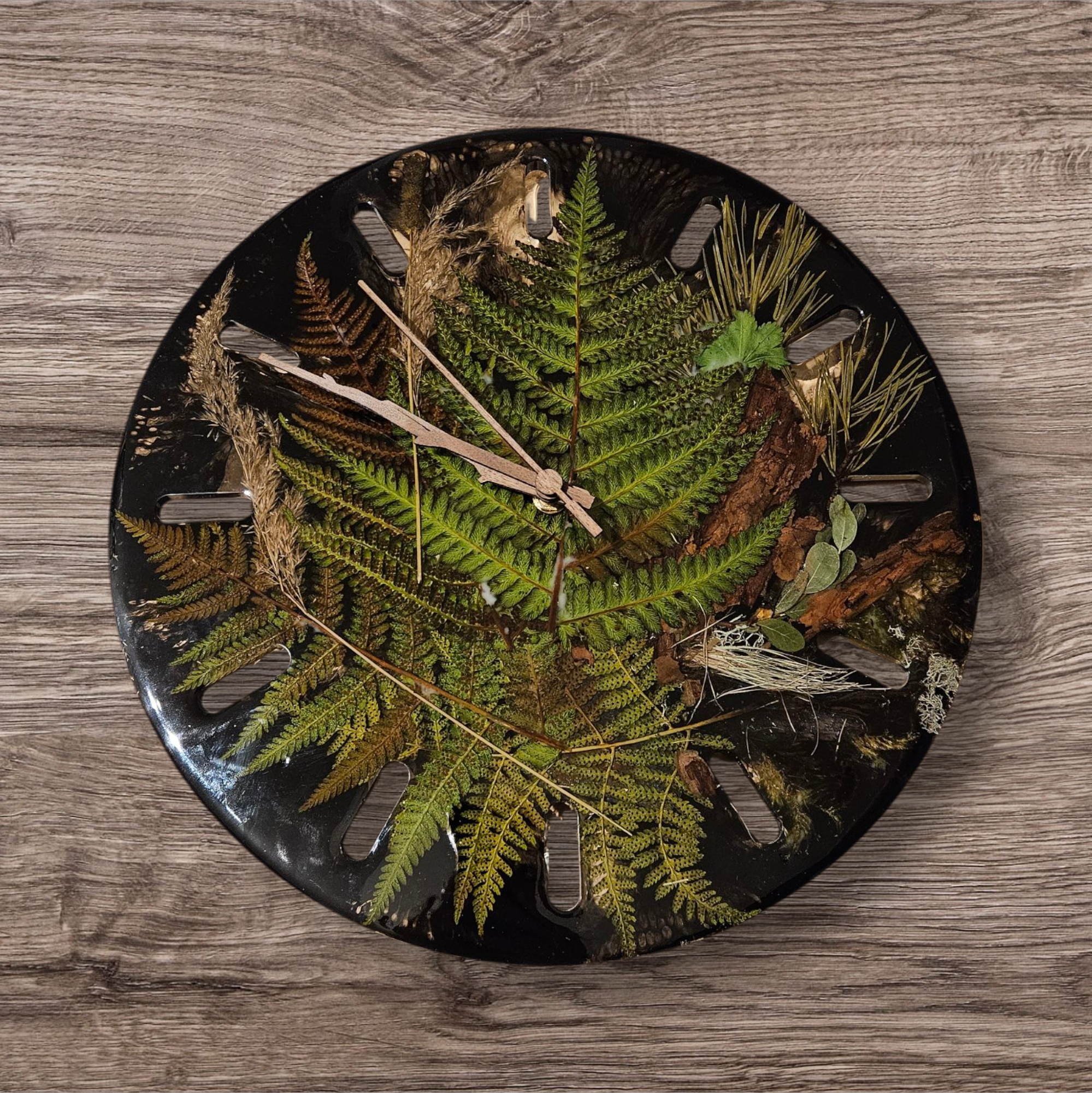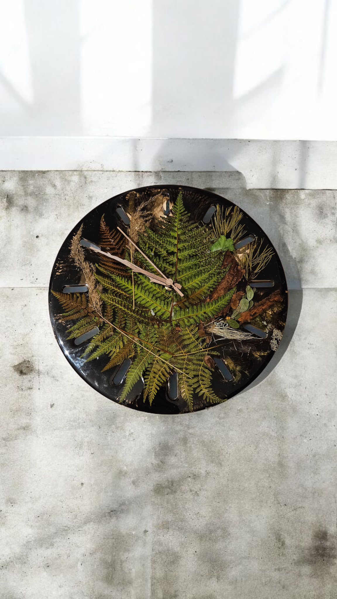 Wall watch Black Fosest 1. Clock with pine bark, fern leaves, moss and other forest greenery. Black pigment