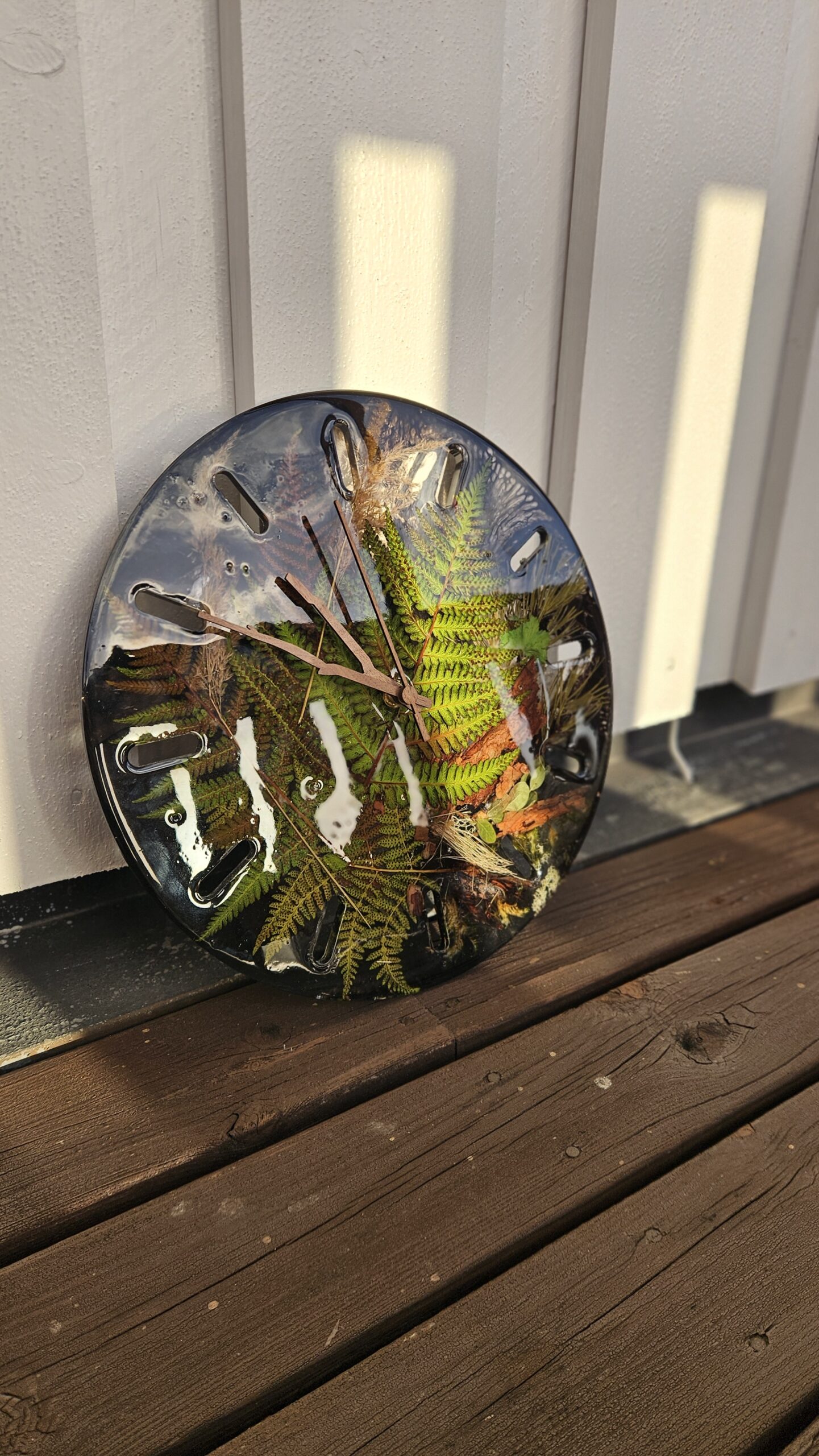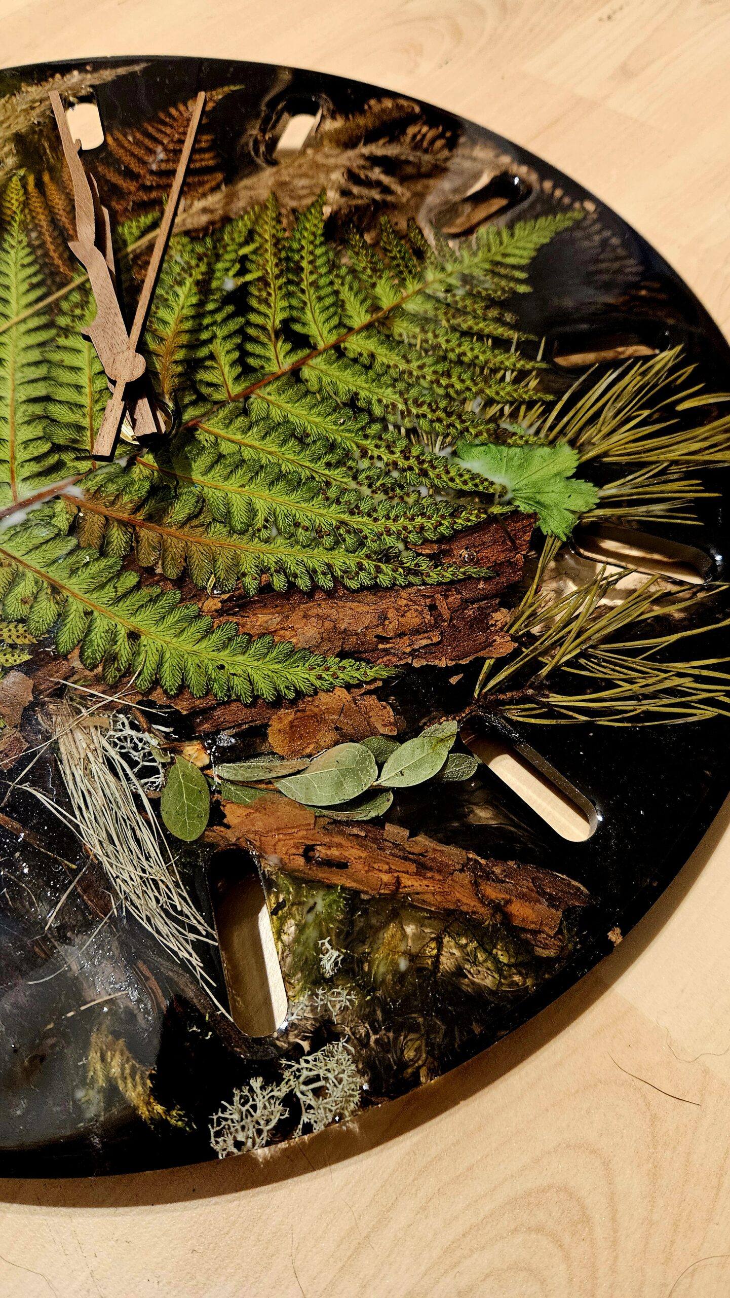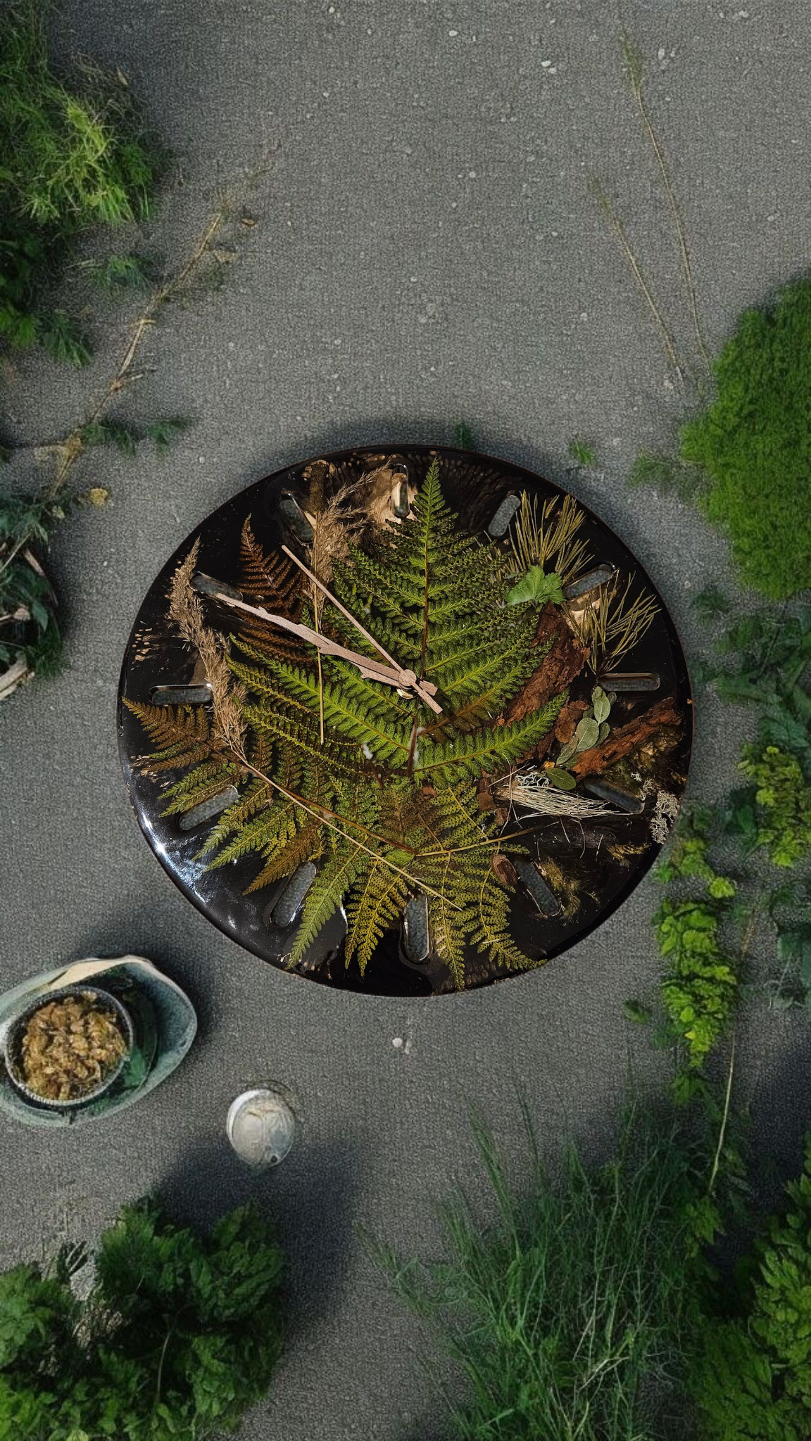 Wall watch Black Fosest 1. Clock with pine bark, fern leaves, moss and other forest greenery. Black pigment