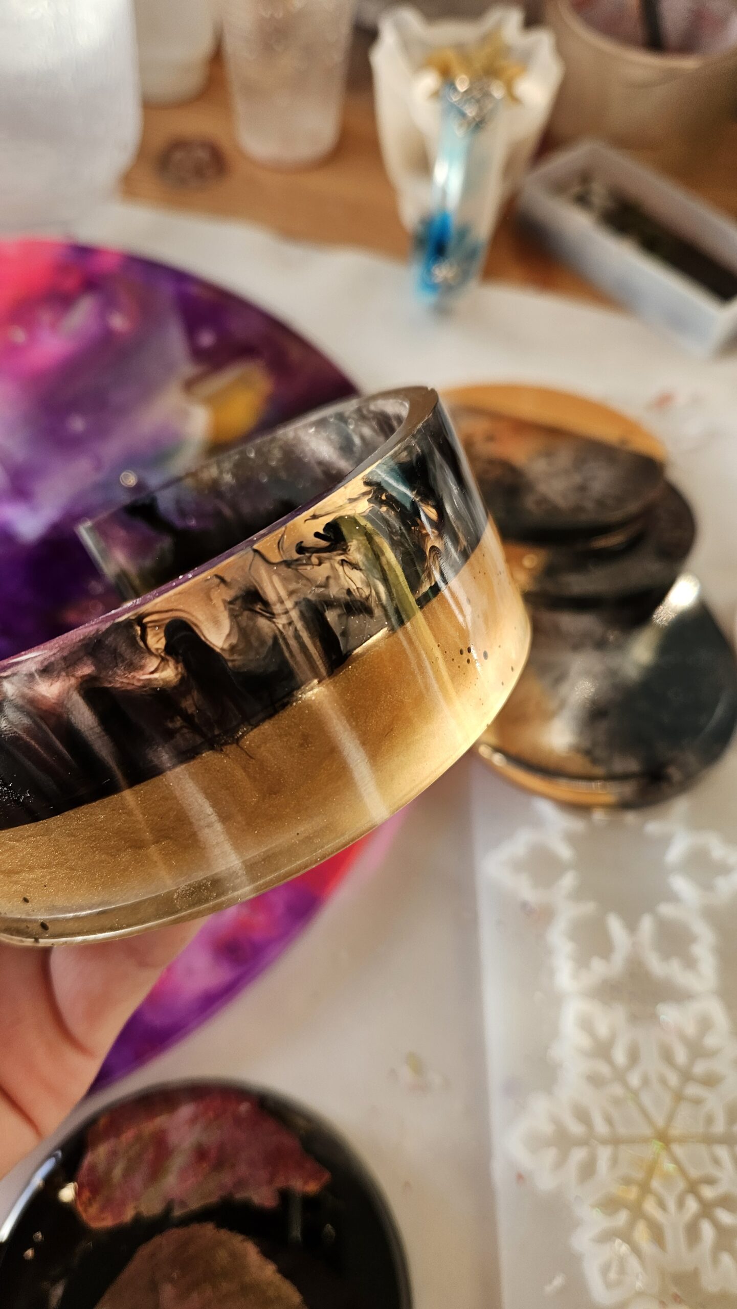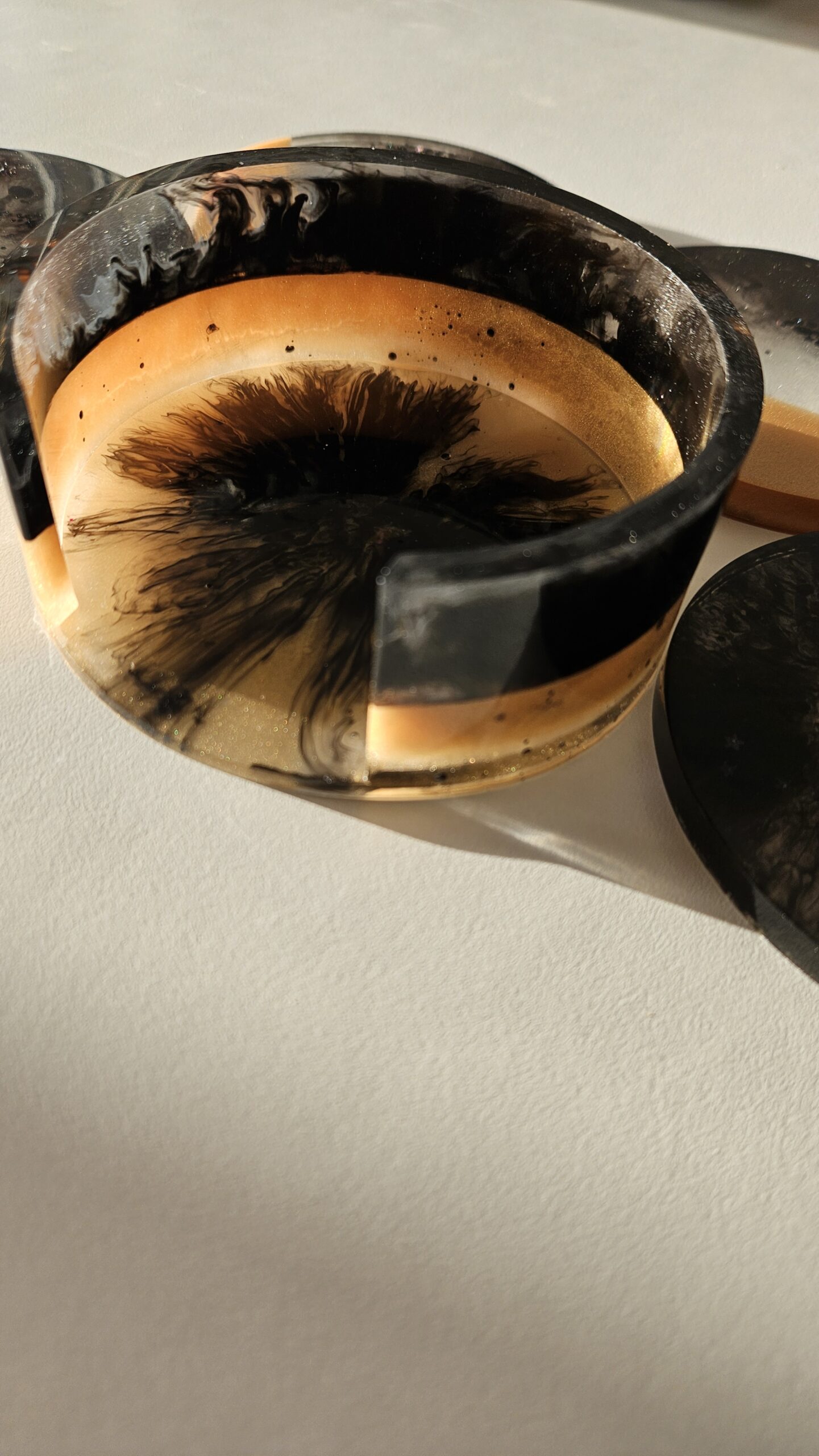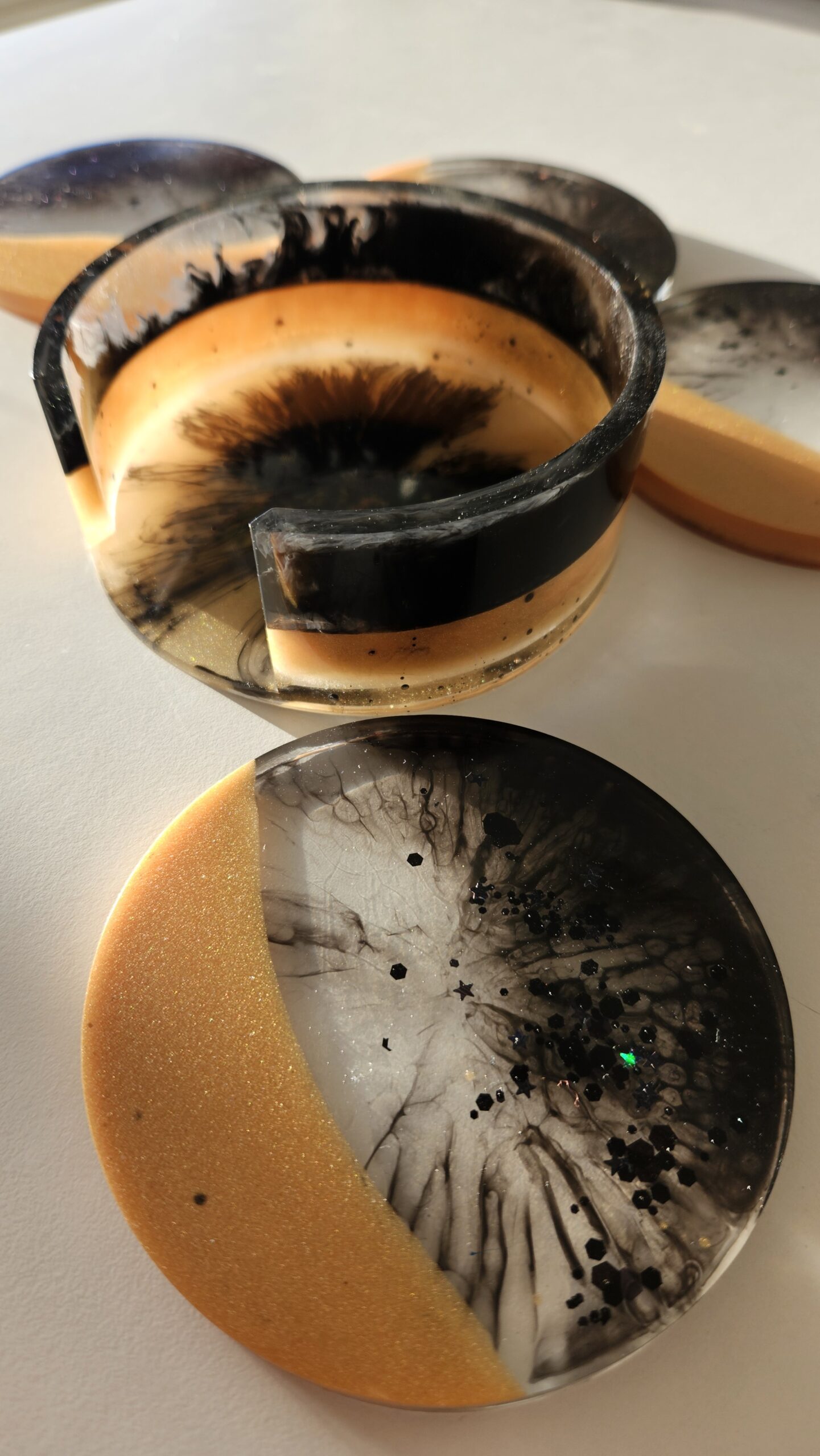 Black Gold coasters. 4 pieces with holder. Black & golden pigment, black glitter