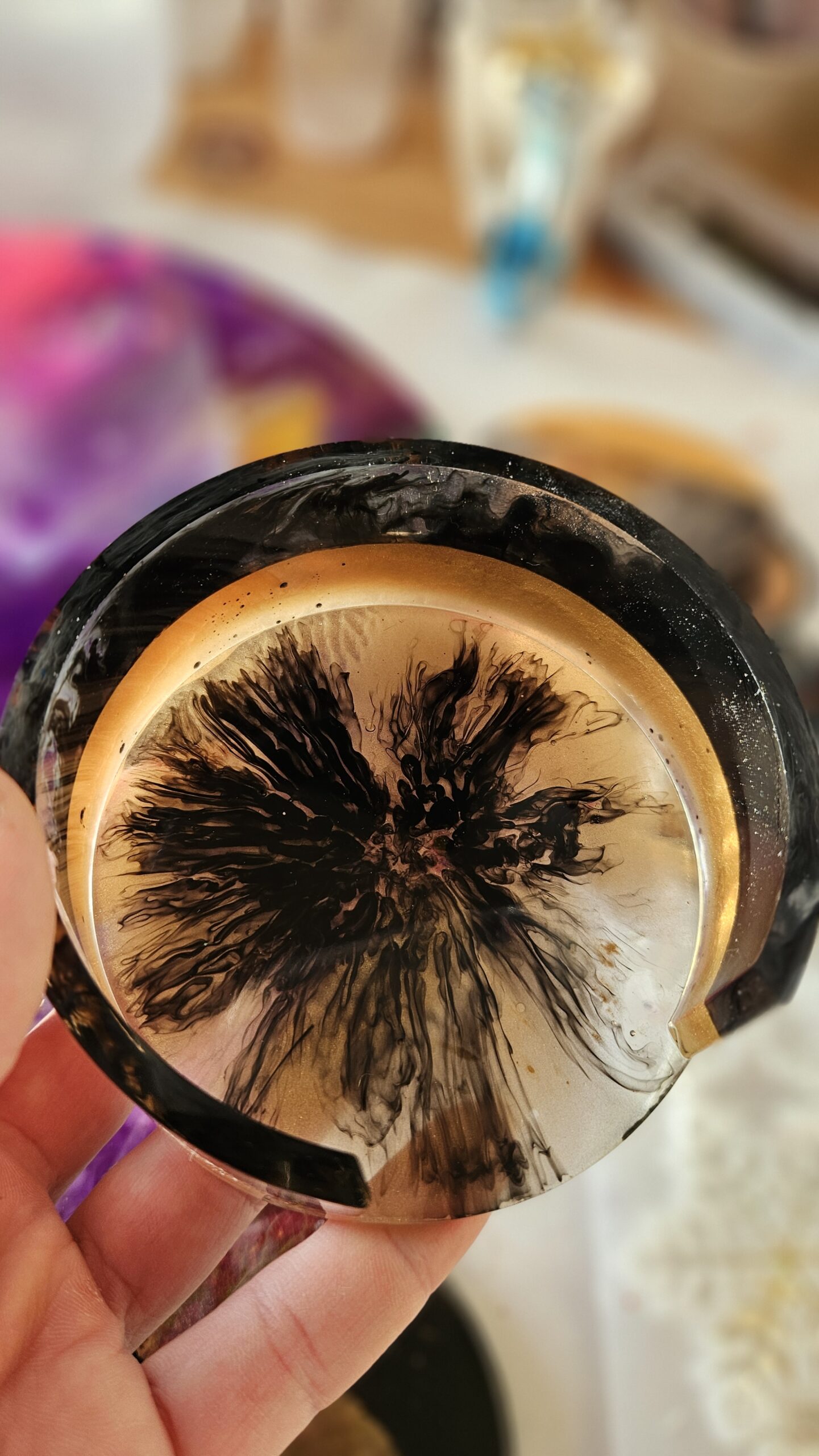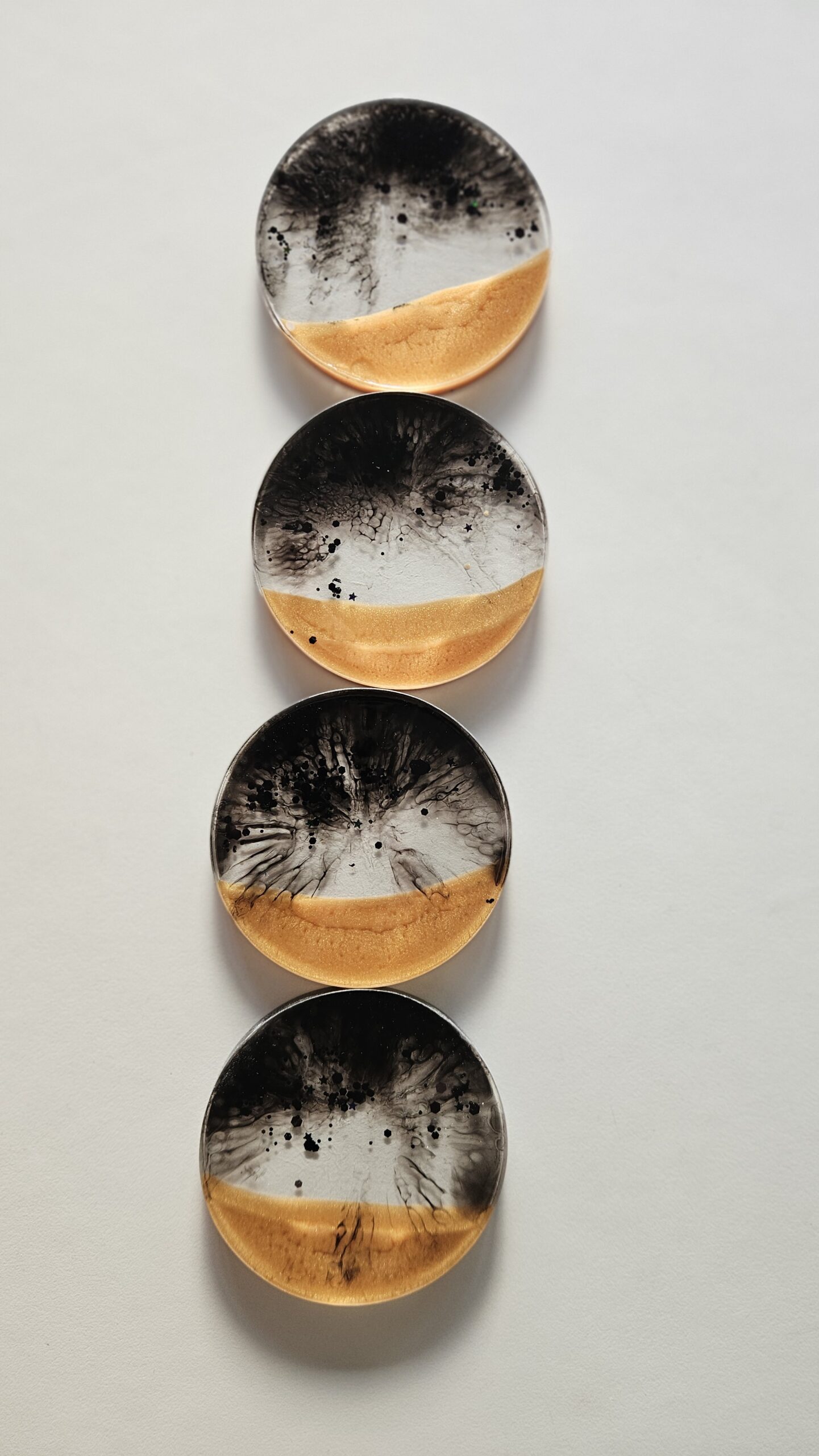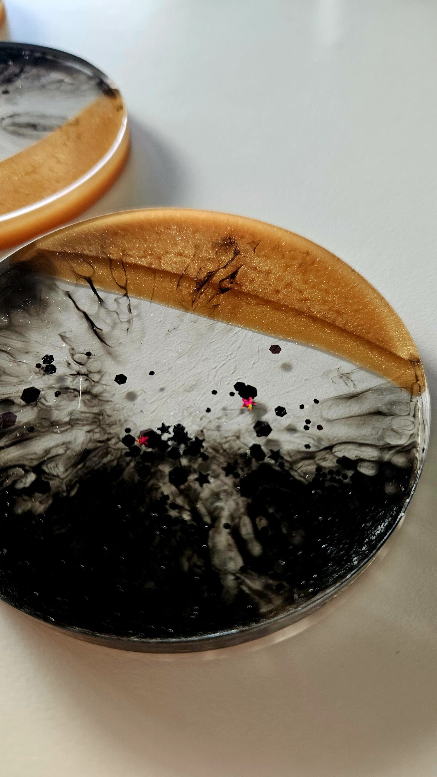 Black Gold coasters. 4 pieces with holder. Black & golden pigment, black glitter