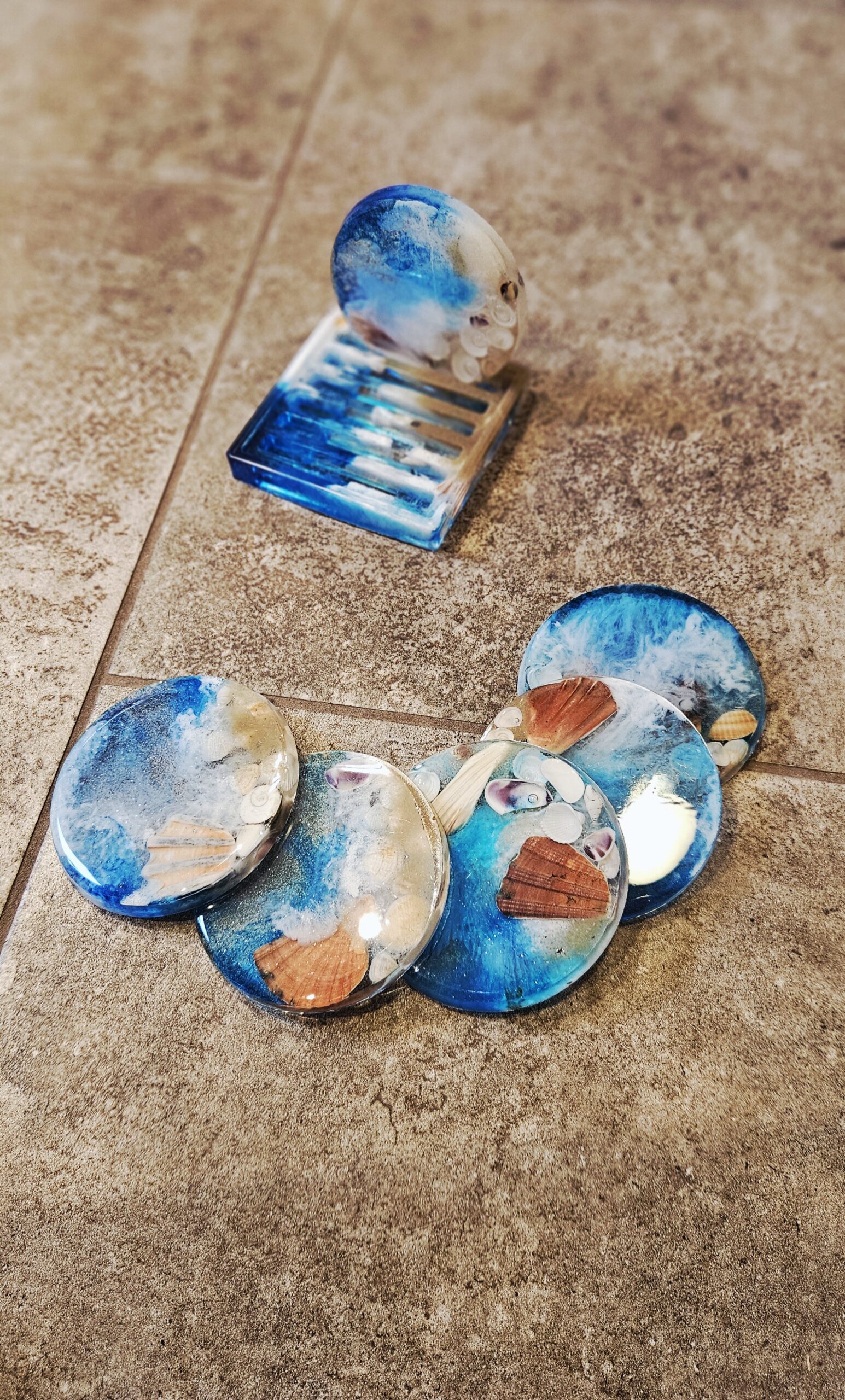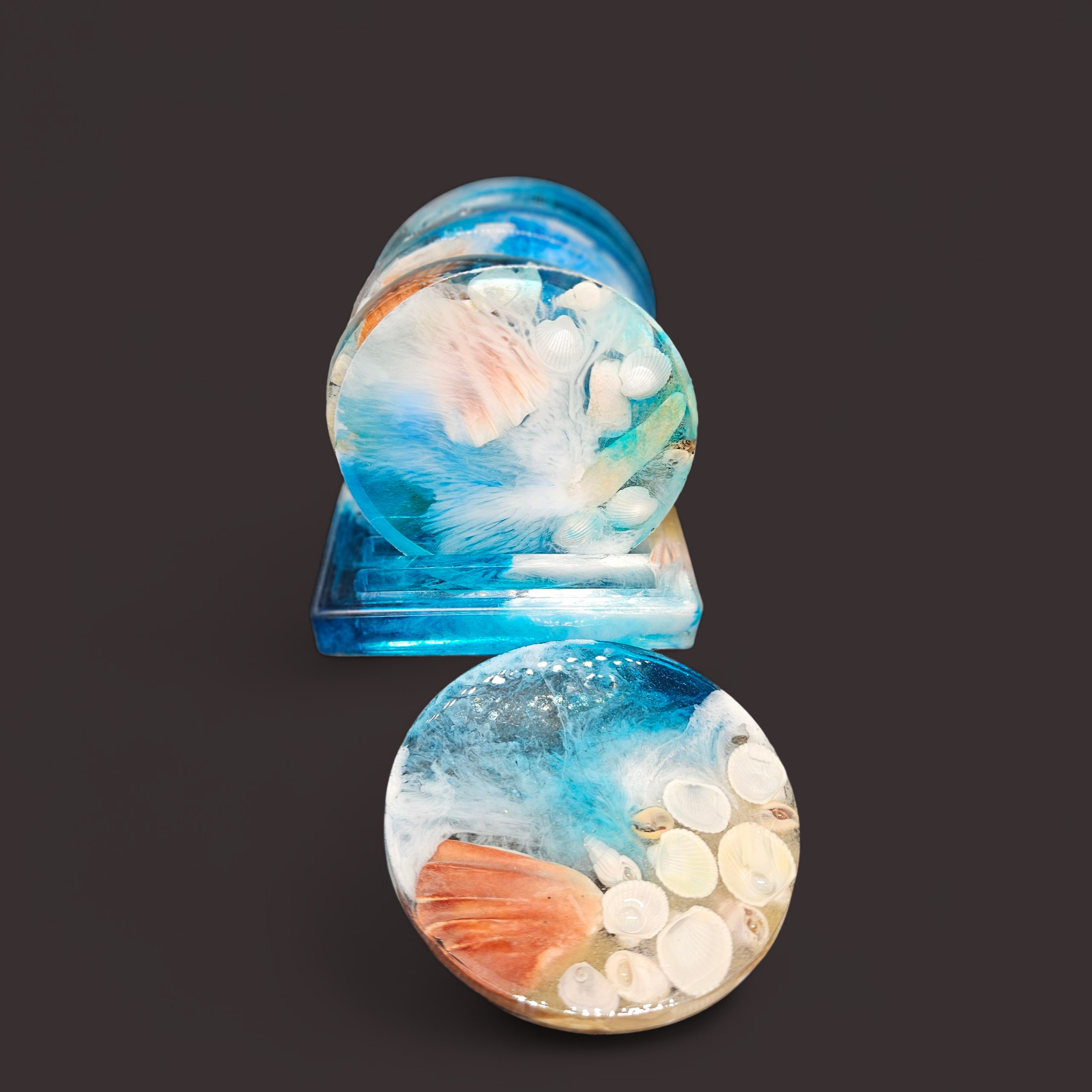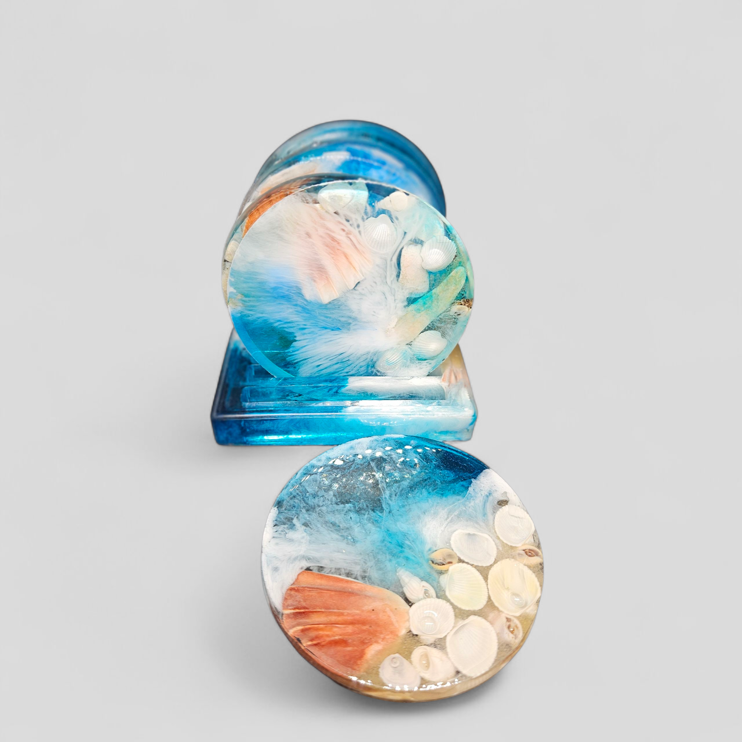Coasters. Sea Shells. 6 pieces with holder. Blue, white pigments, sea shells and sand