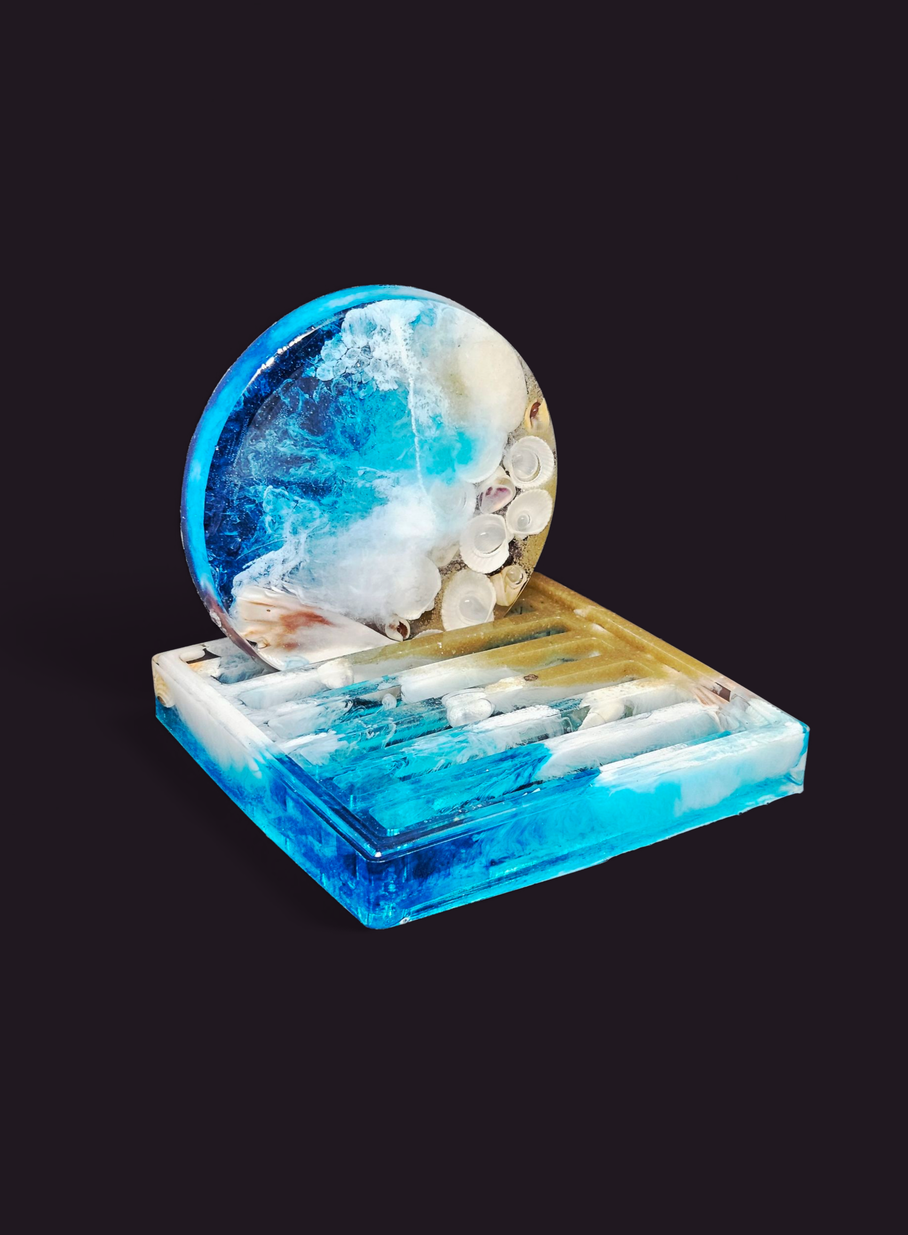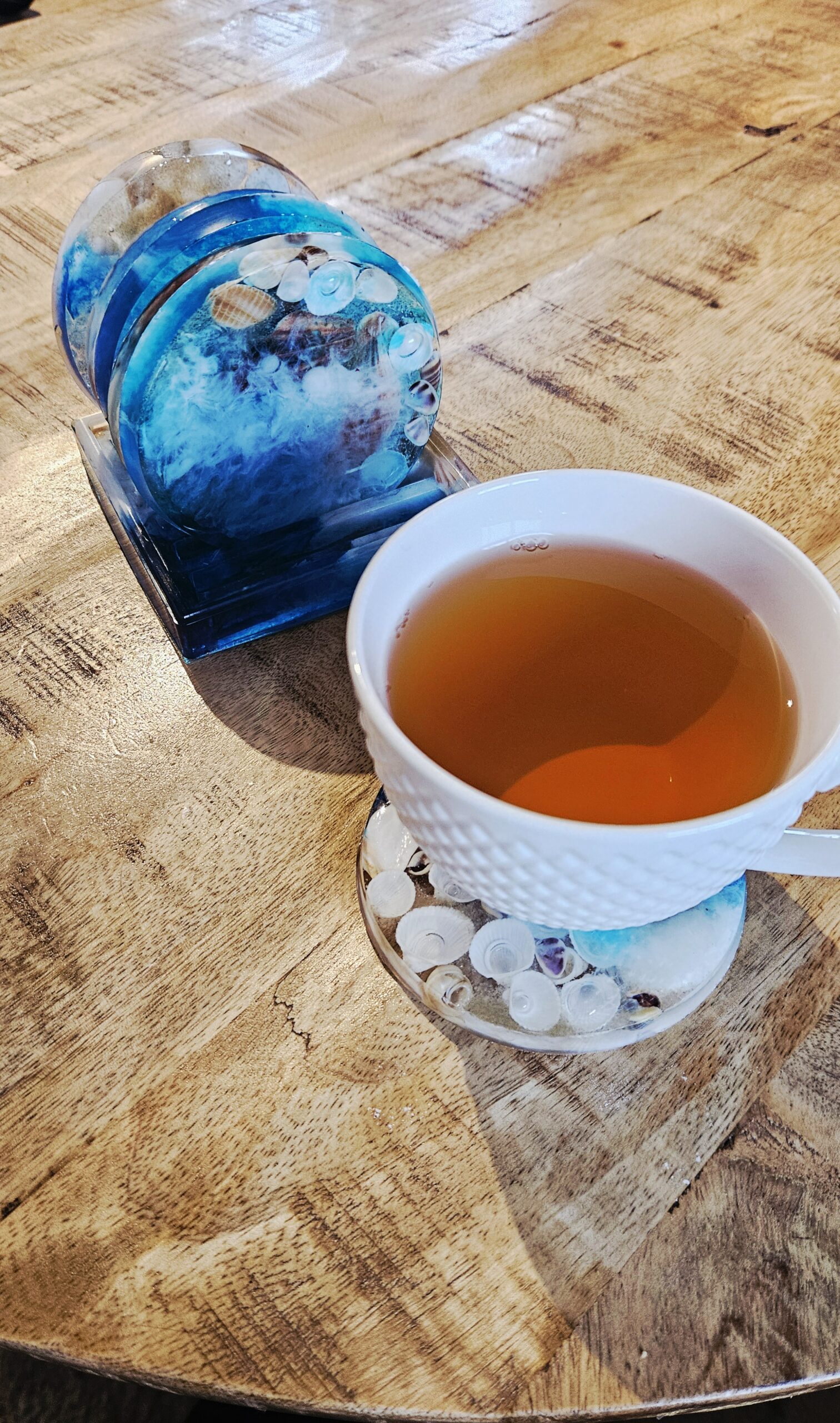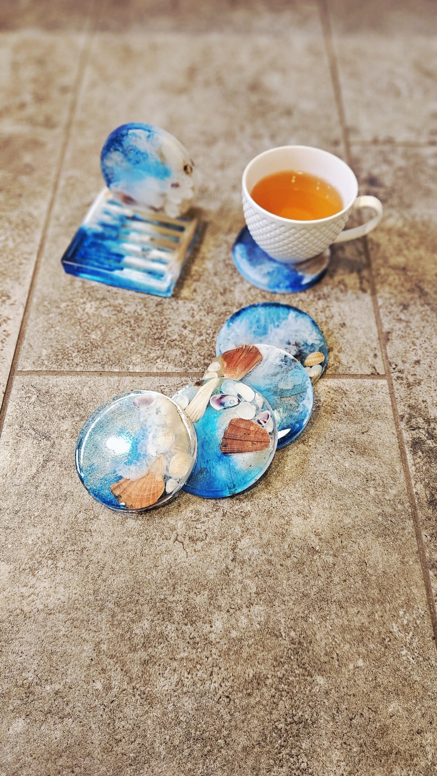 Coasters. Sea Shells. 6 pieces with holder. Blue, white pigments, sea shells and sand