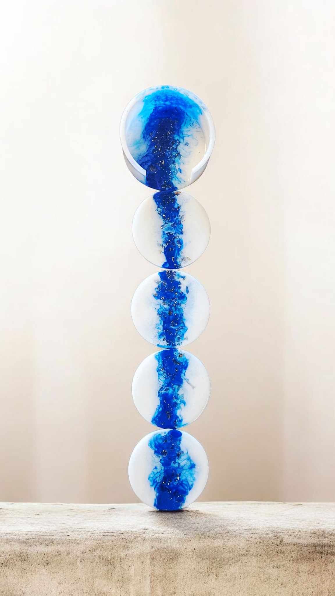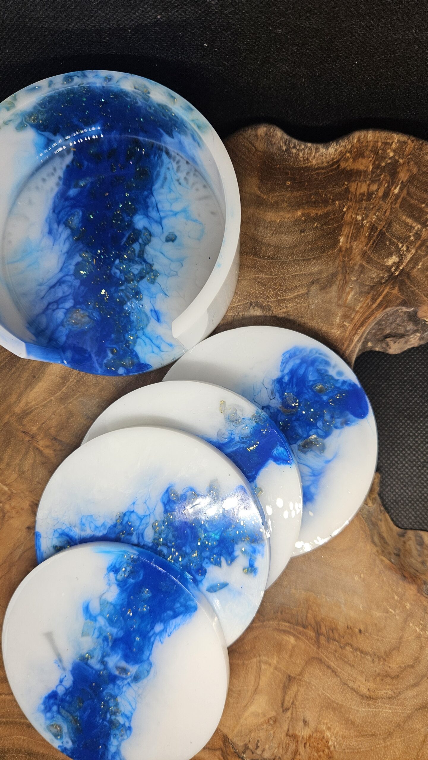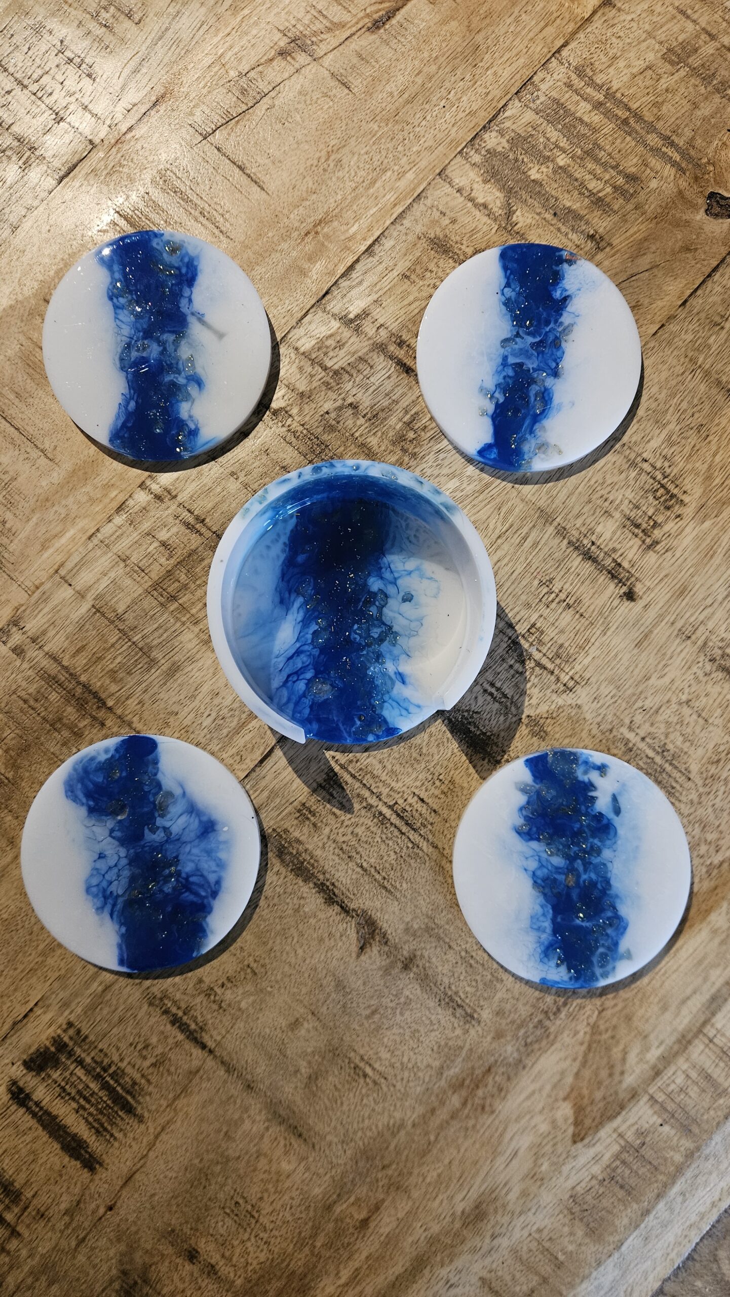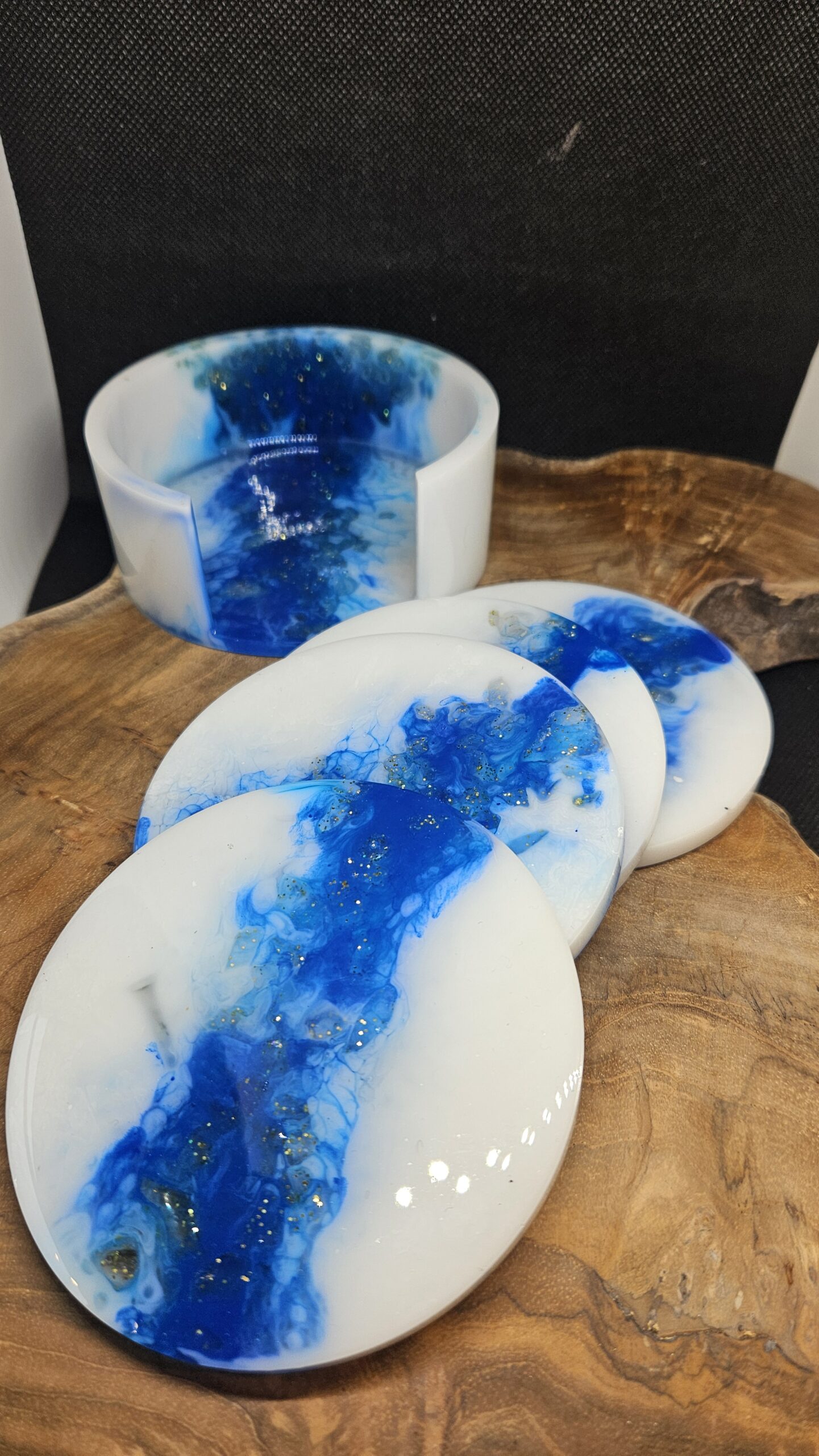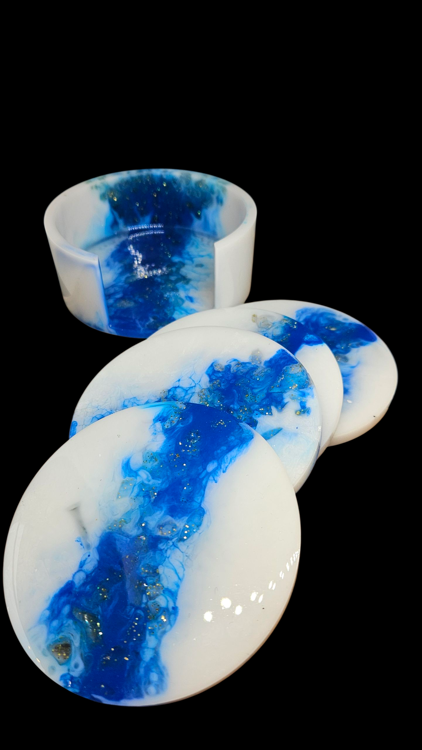 White & Blue coasters with golden glitter stones that you can see through. 4 pieces with holder